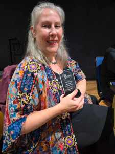 I held my breath, and my fingers shook with nerves as director Kevin Barnes and eight actors, all dressed in black, but with hints of their characters in their accessories—a priest’s collar for Pastor Bob, goth makeup for June, a medicine woman-type necklace for Euphazine—took the stage backed by a projection of the Blue Ridge Mountains. The moment the piece began, those nerves were replaced with joy, and I teared up as the reading of my beautiful play began, and the director gently touched the wind chimes he’d attached to his podium and read the opening stage directions. The audience was captivated and laughed in all the right places. They were moved by the piece, too, which is, for me, the biggest compliment I can hear.